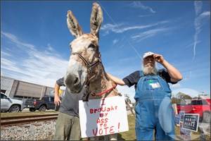 Hines is the uncle of District Court judge candidate Daniel Hines Entzminger. The Dixie Queen is nearby the fire station. He hung a hand-painted sign around the neck of the Donkey, named Ellie May. It said “I brought my ass to vote.”