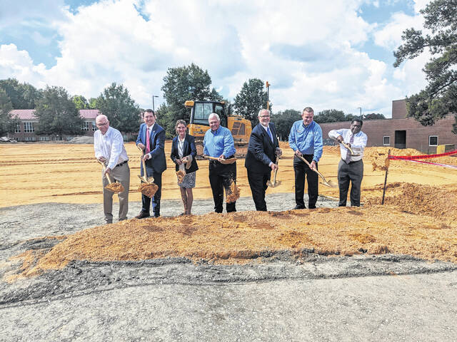 Richmond Community College leaders were joined by Hendrick Automotive Group Chairman and CEO Rick Hendrick on Wednesday to break ground on the new Hendrick Center for Automotive Training at the Hamlet Campus. Shown, from left, are former RichmondCC president Dale McInnis; Sen. Dave Craven; Board of Trustees Chair Claudia Robinette; Hendrick; RichmondCC President Brent Barbee; Roger Mesiemore, vice-president of Fixed Operations for the Hendrick Automotive Group; and Rep. Garland Pierce.