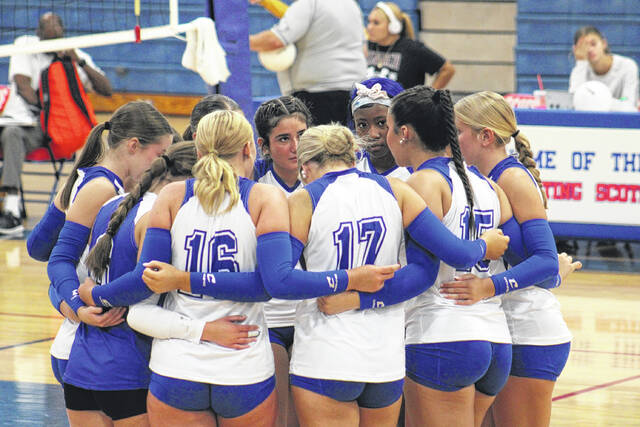 The Fighting Lady Scots huddle together in preparation before taking the floor, later defeating Fairmont in a hard-fought volleyball match.