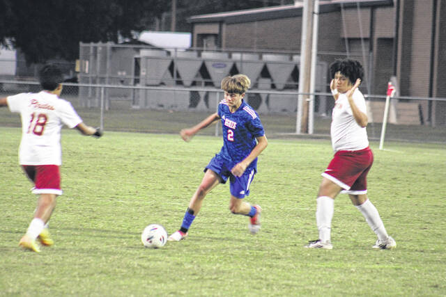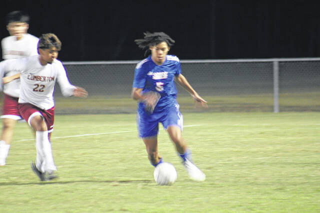 Fighting Scots senior Jake Tew (2) advances the ball against the Lumberton Pirates, looking to spark the offense during recent soccer action.