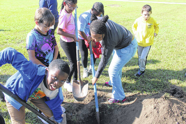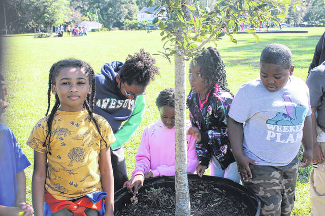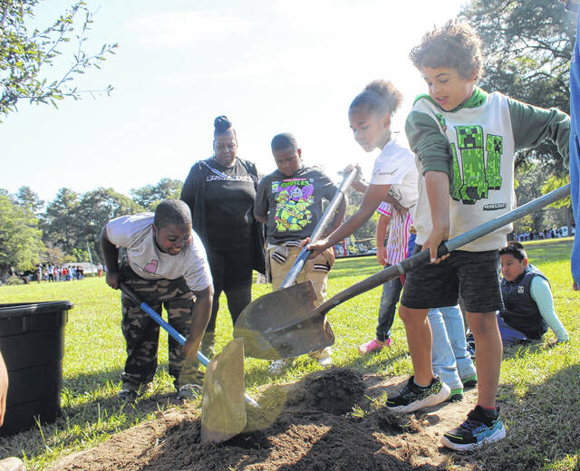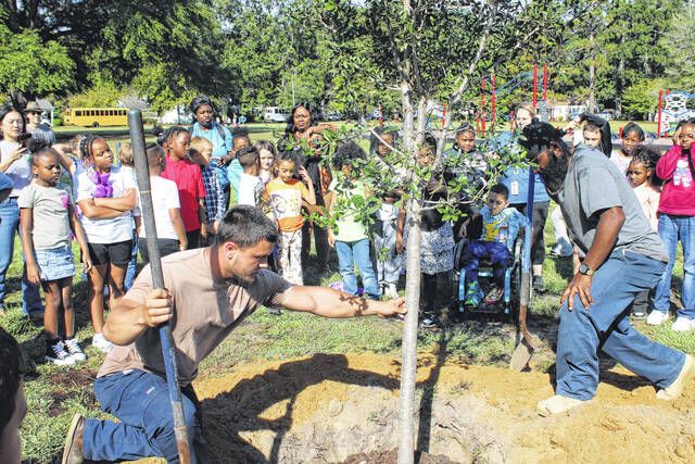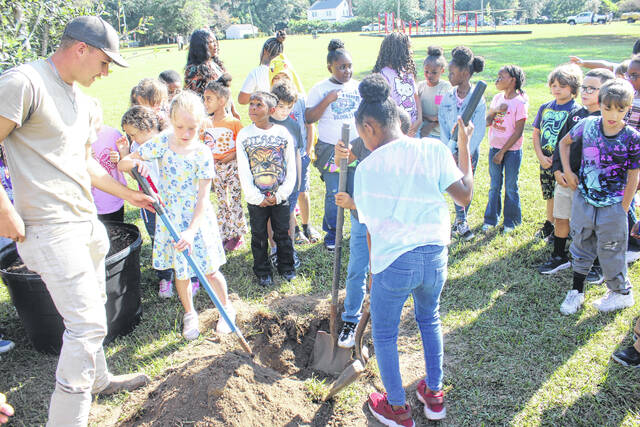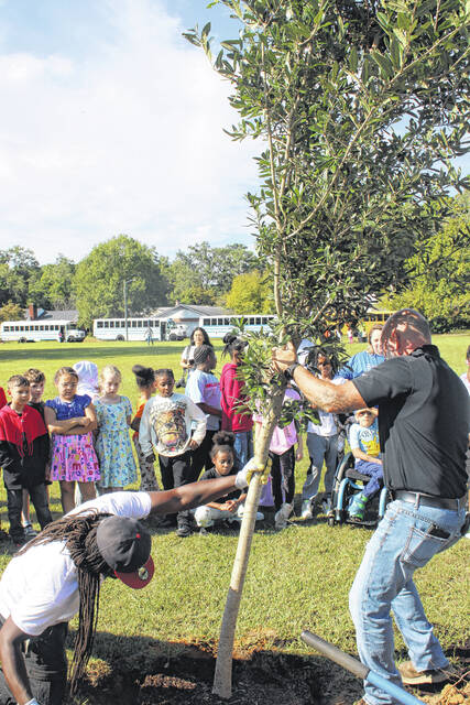 Three live oak trees were planted at the park with the help of about 100 students from South Johnson and Sycamore Lane elementary schools. Led by members of the City of Laurinburg’s Beautification Department, students learned the full process of tree planting, including digging the proper hole, preparing the tree’s roots, and placing the tree correctly in the ground.