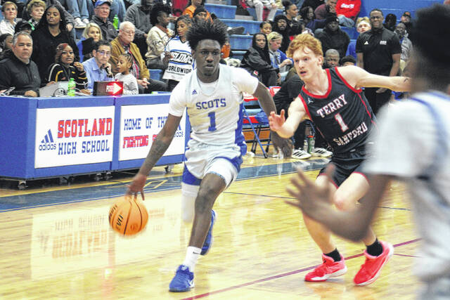 Scots senior Zaymon Gibson (1) drives past a Terry Sanford defender during Friday’s game.