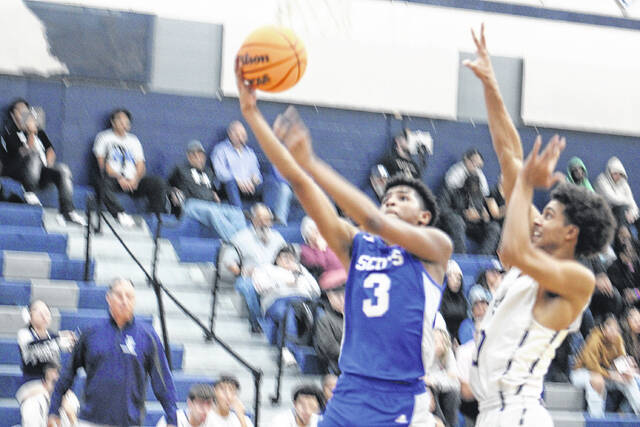 Scots sophomore Kam Prince (3) goes up for a layup as a Purnell Swett defender contests on Jan.22,2026.