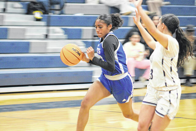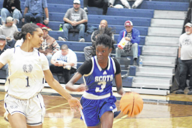 Scots freshman Amaria Bostick (3) attempts to get past a Purnell Swett defender on Jan. 22, 2026.