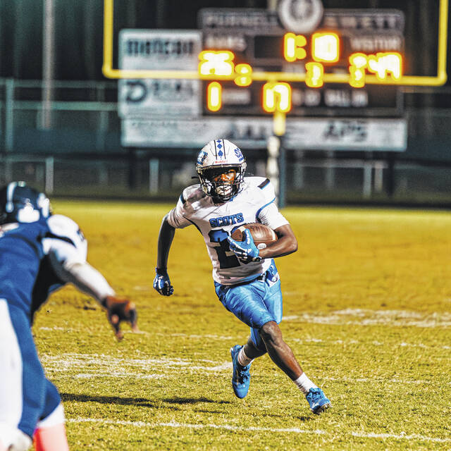 Michael McLean running with the football against Purnell Swett on Oct. 17, 2025. The freshman recently received a Division I scholarship from East Carolina University.