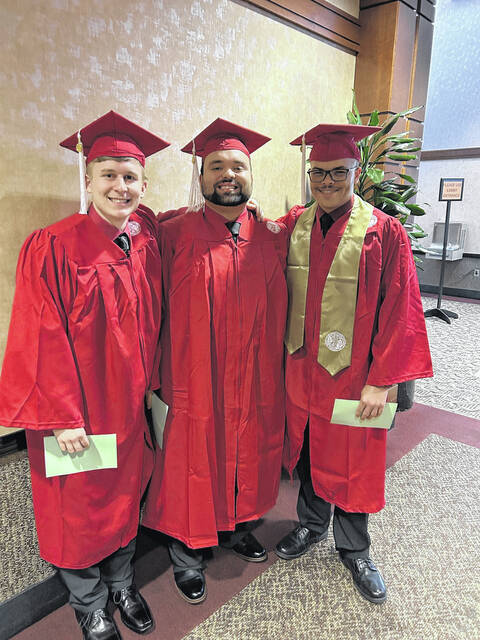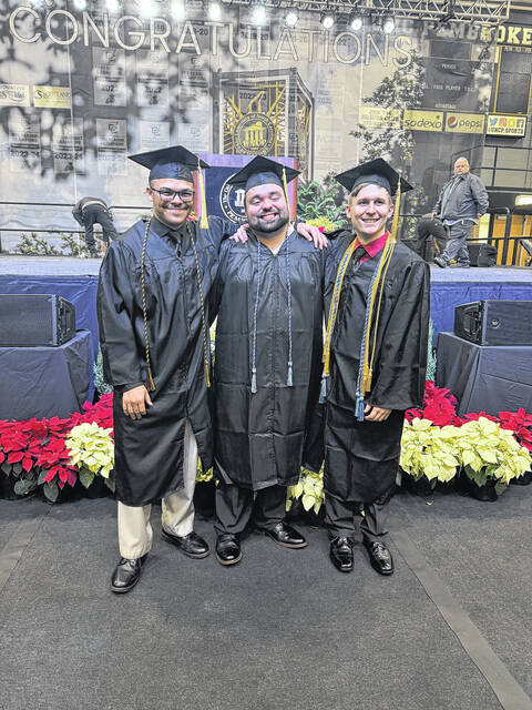 Caleb Locklear, left, Kendrick Oxendine and McLean Pait III celebrate after earning their degrees from UNC Pembroke on Dec. 13, 2025.