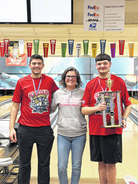LAURINBURG — The Scotland boys’ bowling team participated in the conference bowling tournament on Friday. Garrett Boyer finished in first place and bowled a perfect game in the individual competition. Kenean Smith finished third in the conference, and Grayson Leviner placed seventh. The team finished third overall and qualified for the state championship Friday at the Sandhills Bowling Center in Aberdeen at 10 a.m.