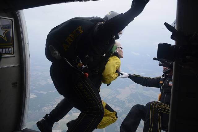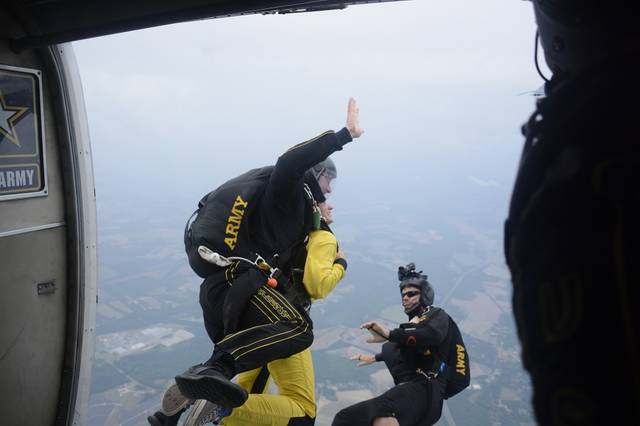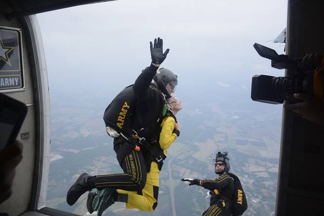 The U.S. Army Parachute team had a tandem parachute jump with representatives from the Steven A. Cohen Military Family Clinic at Centerstone in Fayetteville along with Team Unbroken from Amazon Prime’s World’s Toughest Race.