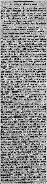 “Yes, Virginia, there is a Santa Claus” is a line from an editorial called “Is There a Santa Claus?” The editorial appeared in the September 21, 1897, edition of The (New York) Sun and has since become part of popular Christmas folklore in the United States. It is the most reprinted newspaper editorial in the English language.