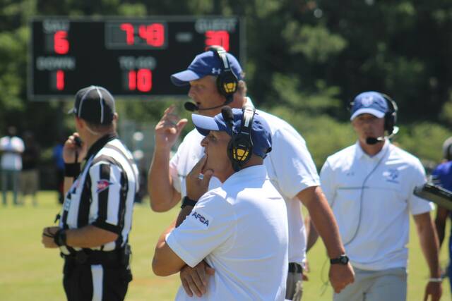 St. Andrews head coach Bob Curtin (near) looks on with offensive coordinator Aaron Christensen next to him and defensive coordinator Trent Fredericks in the background during a game against Lindsey Wilson on Sep. 2.
